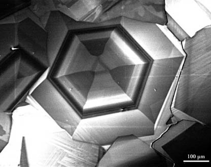 This example shows both sector and concentric zoning in hydrothermal vein quartz, possibly due to Al variation. The sample has been polished flat and is viewed looking down the (0001) axis. The sector zoning appears related to the positive and negative rhomb orientations and may have potential therefore for indicating dauphine twinning. Note that the true trigonal symmetry at the very centre has been replaced quickly by a pseudo-hexagonal symmetry throughout much of the grain.