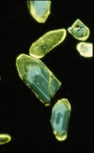 ![]() Cathodoluminescence(CL) image of zircon grains from the Old Woman granodiorite, Mojave Desert, southeastern California. Yellow-green CL regions are magmatic overgrowths of Mesozoic age(~72 Ma), and bright and dark blue CL regions are inherited Proterozoic cores which range in age from 1.4 to 1.8 Ga(Foster et al., 1989; Miller et al., 1992). Photograph taken using Kodak Ektachrome 200 slide film. The length of the long axis of image is 770 micrometers.